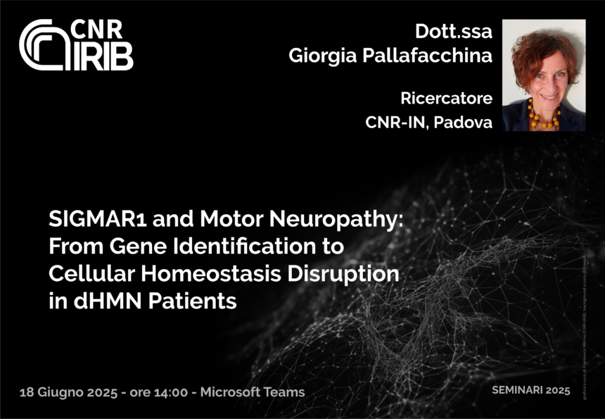 Distal hereditary motor neuropathies (dHMN) are a heterogeneous group of neurodegenerative disorders marked by selective motor neuron degeneration. Recent studies have identified loss-of-function mutations in SIGMAR1 as a genetic cause of a recessive form of dHMN. The presentation will outline the scientific journey of Dr. Pallafacchina’s group from the genetic identification of SIGMAR1 as a disease gene to the molecular dissection of the Sigma-1R protein role in ER-mitochondria tethering, Ca2+ signaling and proteostasis, and the consequences of its dysfunction on global cellular homeostasis in human cells from dHMN patients.