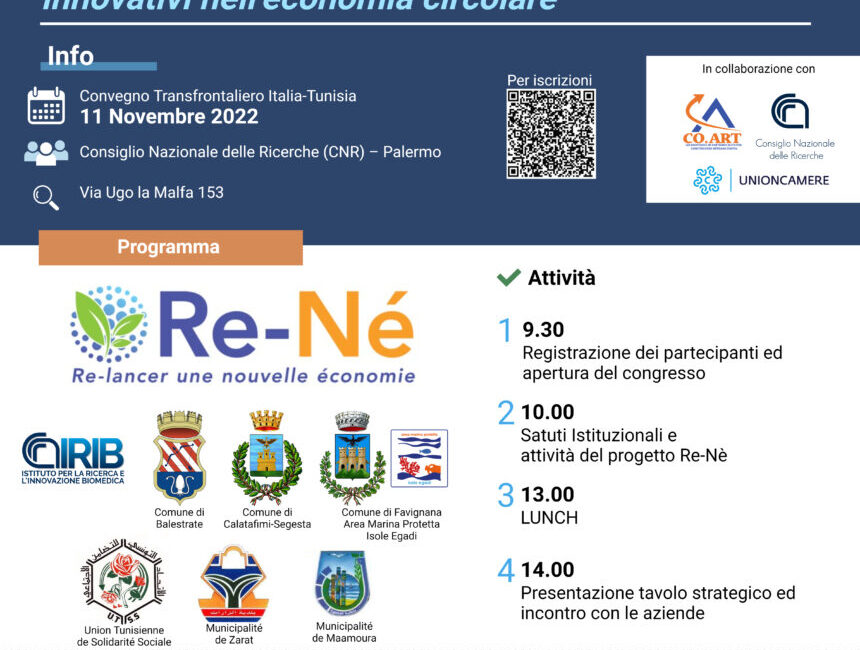 E’ un piacere informarvi che nell’ambito del Programma ENI di Cooperazione transfrontaliera Italia Tunisia 2014-2020 I’Istituto per la Ricerca e l’Innovazione Biomedica (IRIB-CNR) di Palermo partner del progetto Re-Né organizza un congresso per il 11 novembre 2022 presso l’Area della Ricerca del CNR di Palermo sita in via Ugo la Malfa 153.